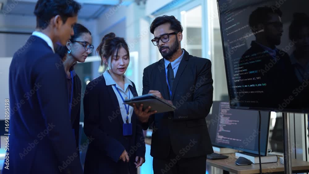 Grupp av tillfälligt klädda affärsfolk som diskuterar idéer i smart casual wear som arbetar på bärbara datorer.
